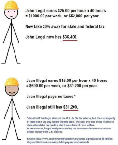 A friend sent me a cartoon that’s been going around his Facebook feed. The cartoon’s message amounts, roughly, to: undocumented immigrants are far better-off than legal residents because taxes.