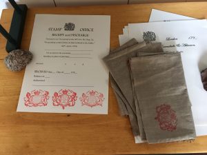 First, John Bull is a popular personification of England. Second, while I’m not sure the particular hat tax Gillray’s referring to, the hat tax was one stamp tax imposed by the British government. Basically, hats had to have an official stamp on the lining (which Grand Portage was kind enough to reproduce for visitors).