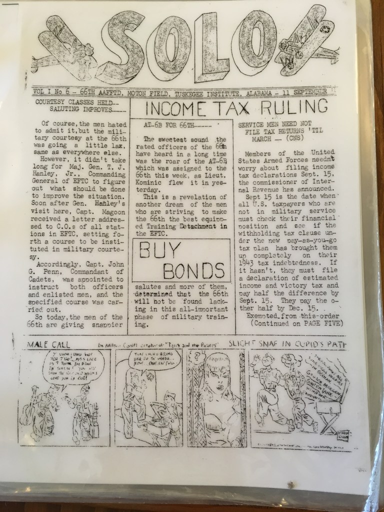 In August of 1943, though, the Treasury Department issued a ruling changing the due date for military personnel. I can’t, in my casually bloggy search, find the actual ruling, but both the newsletter from Tuskegee and this Chicago Tribune article refer to it.