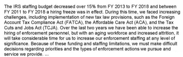 Basically, the IRS has been forced to make tough decisions about priorities due in part to significant cuts to its staffing budget. It’s not surprising that even before the NY Times story on Pres. Trump’s returns, many of us have been calling for Congress to adequately #FundTheIRS.