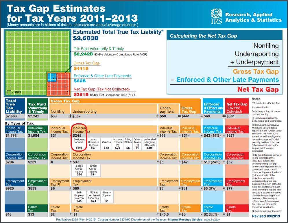 Where much tax noncompliance occurs is with respect to income earned by the self-employed and small businesses, where there’s much less third-party reporting and also more use of untraceable cash. (I added the red circle to the IRS image below.)