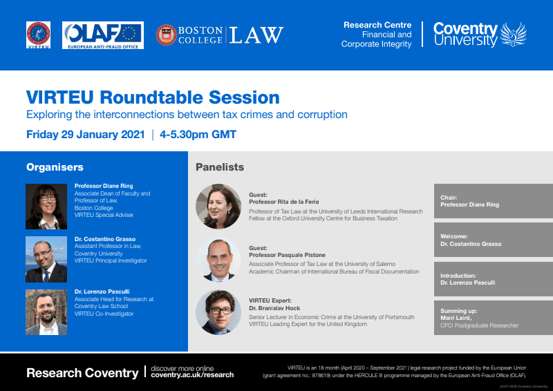 VIRTEU, for which I am a special advisor, is hosting a Roundtable Discussion Series this spring that brings together experts from academic institutions, nongovernmental organizations, and the private sector to engage in topical discussions around the general problem of tax fraud and corruption. Along with the the VIRTEU project’s Principal Investigator Dr. Costantino Grasso and Co-Investigator Dr. Lorenzo Pasculli, I will be organizing and hosting the series, which is also sponsored by Boston College Law School, Coventry University Research Centre on Financial and Corporate Integrity, and OLAF (the European Anti-Fraud Office).