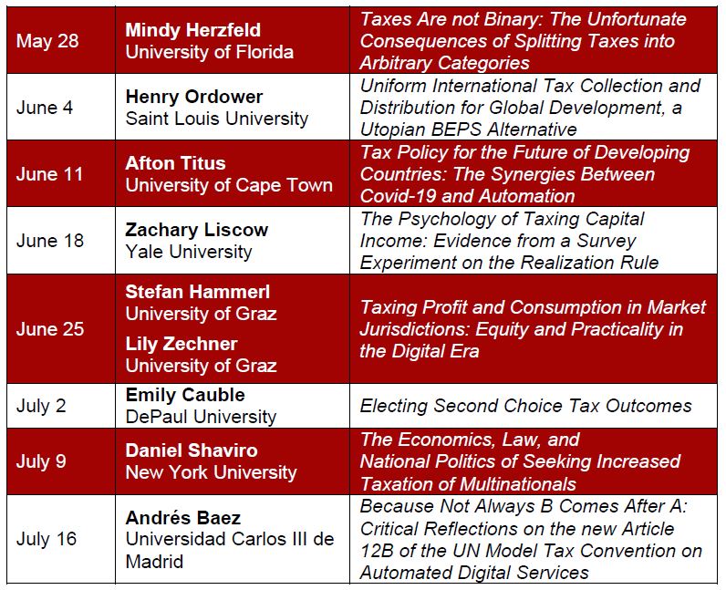 | Aug. 6 | Steven Dean, New York University | A Constitutional Moment in Cross-Border Taxation |