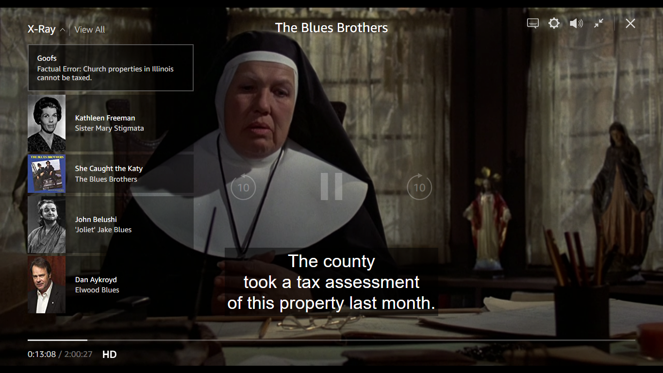 I’d also never watched a movie with Amazon’s X-Ray feature before. And X-Ray announced that the motivation for their mission from God is a factual error, because Illinois doesn’t tax church property.